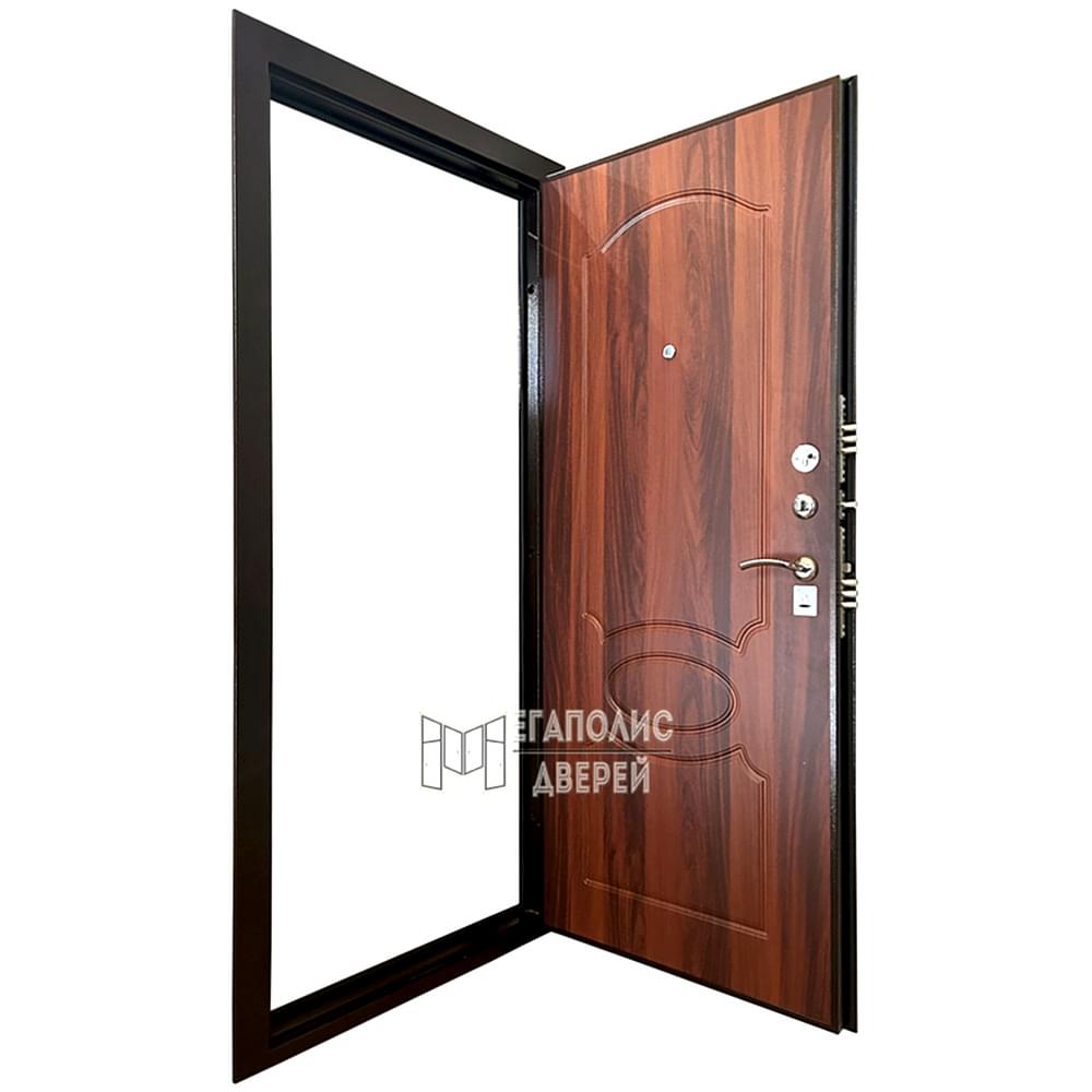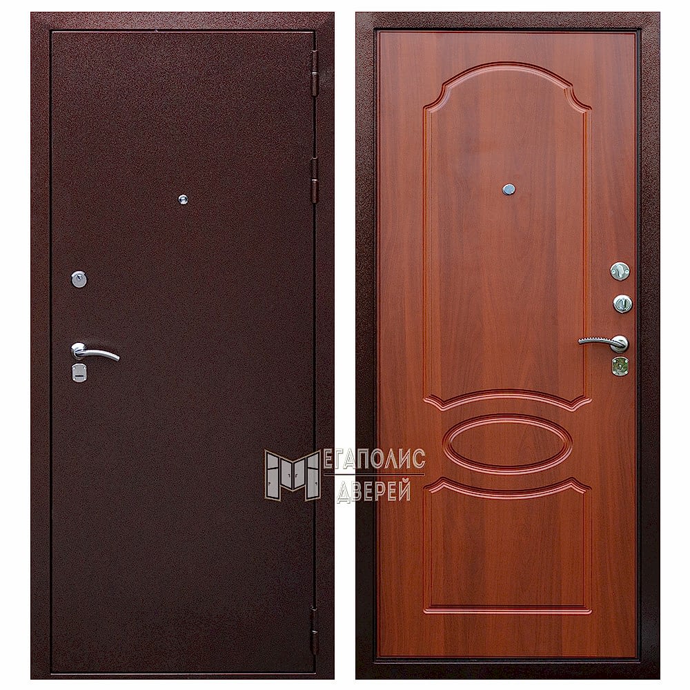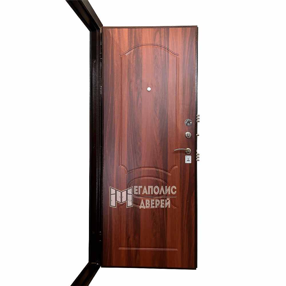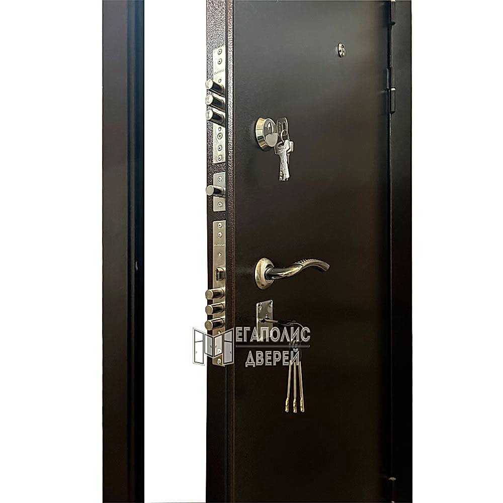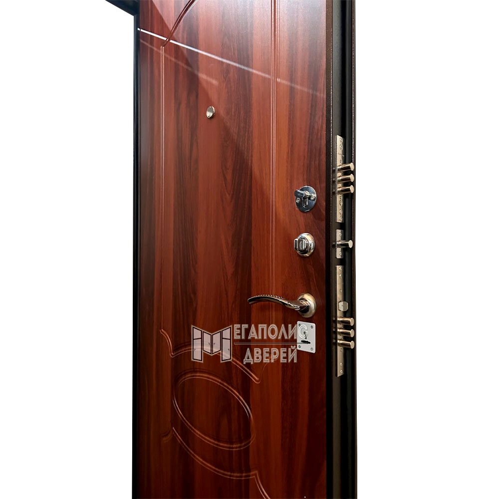 Дверь изготовлена из Pin-Up и имеет два замка Гардиан 4 класса взломостойкости, а также ночную задвижку. Два уплотнительных контура и базальтовая плита в качестве наполнителя обеспечивают достаточно высокий уровень шумоизоляции. С внешней стороны дверь окрашена в темный цвет «Антик-медь». А цвет внутренней стороны вы можете выбрать в зависимости от интерьера вашей квартиры - миндаль, белый дуб или венге.