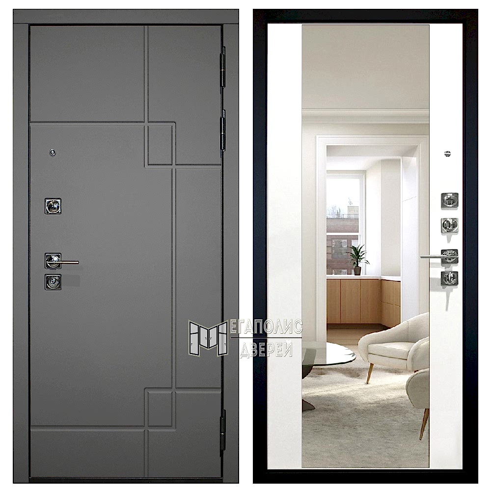 Дизайн наружной стороны полотна выгодно Pin-Up от большинства типовых моделей входных дверей. Внутренняя МДФ панель с большим зеркалом послужит практичным дополнением интерьера и поработает на визуальное расширение пространства.