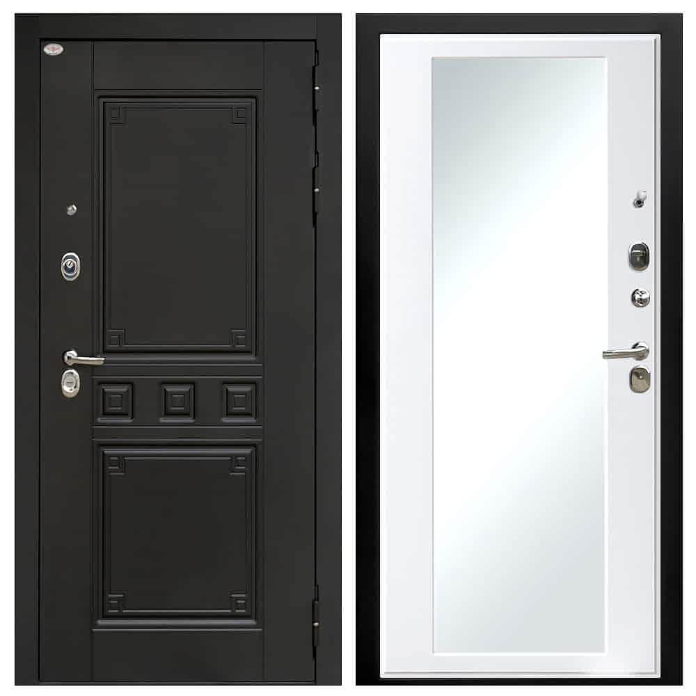 У двери Выбор 12 Максимум Зеркало такой красивый дизайн снаружи, что глаз не оторвать! В то же время узор не вычурный, очень сдержанный, без лишних навязчивых декоративных элементов - классика на все времена. Изнутри полотно отделано зеркалом, что хорошо работает на расширение пространства узкого коридора и добавляет помещению отражённого света.